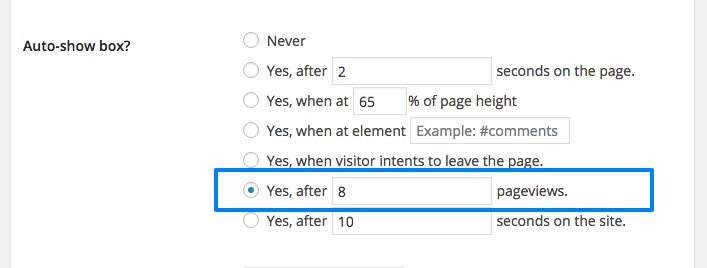 On the admin page where you configure your box, a new trigger option appears that allows you to toggle a box once a visitor viewed a certain number of pages.