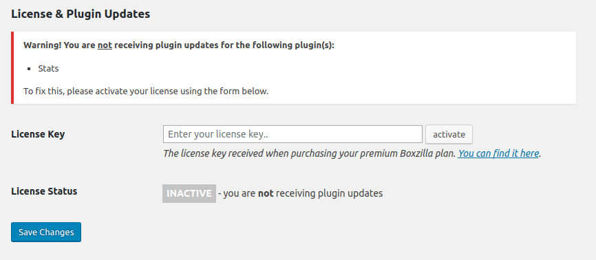 After you've activated the add-on plugin in your WordPress admin area, head over to Boxzilla > Settings and locate the license key form.